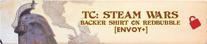 A TC: Steam Wars-themed Backer shirt will be hosted on Onyx Path’s Redbubble store for a limited time. All backers will be notified when the shirt becomes available for purchase. [Envoy reward tier+]